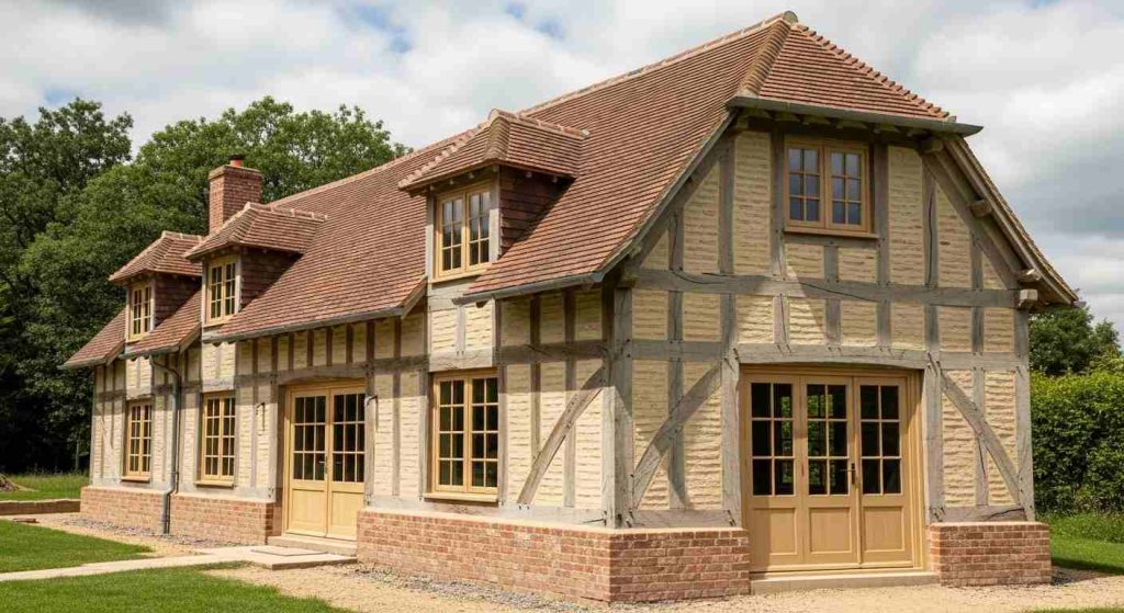 | Why it Works | The frame is structural and not decorative. The exposed oak beams create a rhythmic facade and let the rendered panels breathe, which is important in the high rainfall Normandy climate. |