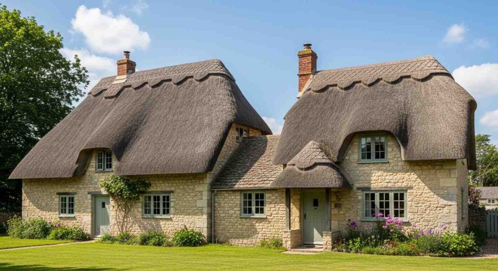 The budget for professional thatch checks every 10 to 15 years if you are restoring an old one (PS3,000-PS6,000 each ridge replacement). Reclaimed stone and modern steel-reinforced frames can be used to create the look of a cottage in this style for about 60% less than full heritage costs.