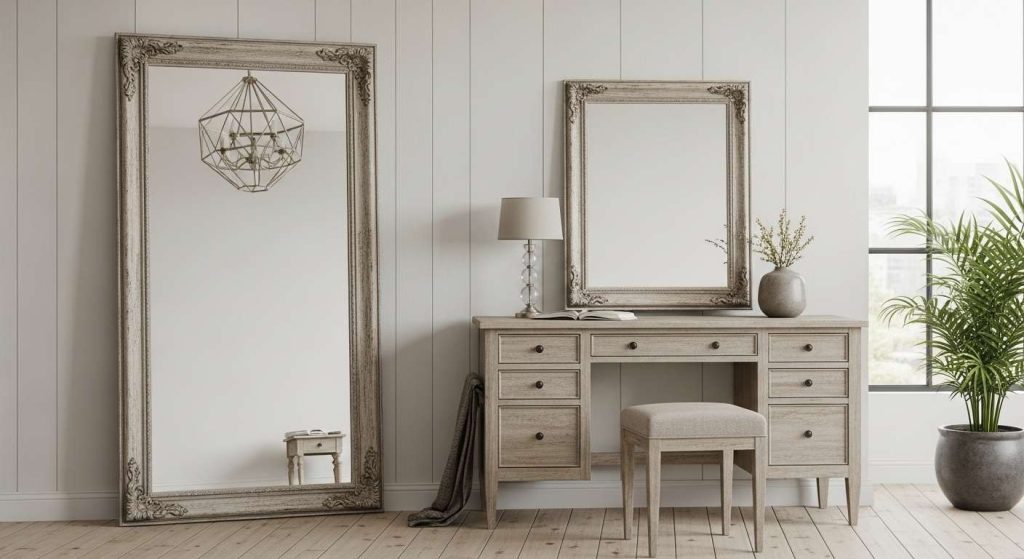 A distressed ornate-framed mirror adds character and elegance. You can lean a tall, framed mirror against the wall in a casual way to give a room a relaxed feeling. Or you can hang it above a dressing table as a statement piece.