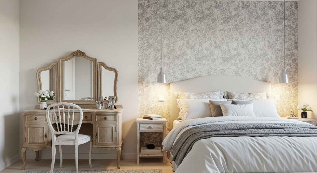 Shabby-chic celebrates chipped paint and visible brushstrokes. A slightly weathered dressing table or whitewashed bedside adds character and charm that mass-produced furniture cannot replicate.