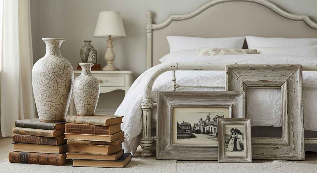 Stack old books at the foot of your bed. Ceramic vases with fine cracks can be displayed. Add black-and white photos to a weathered picture frame.