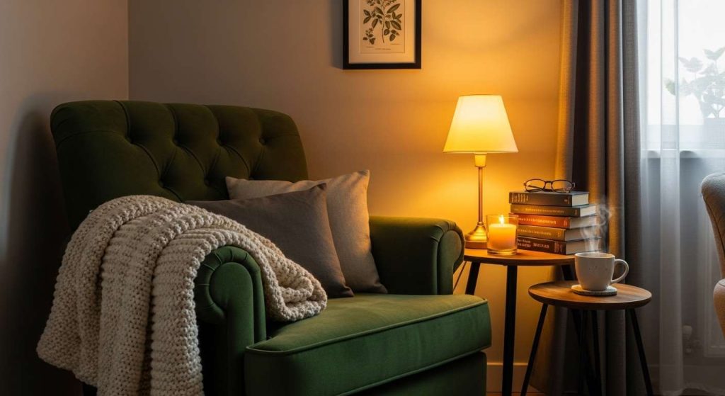 The combination of a tufted chair, a soft blanket and a small table can create a tranquil retreat. For warm lighting, add a small lamp or candle.