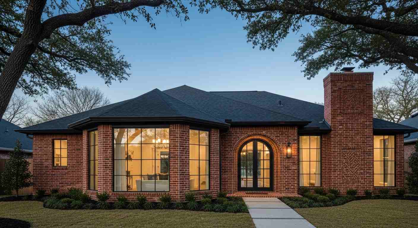 Design #5 Modern Brick Ranch – Red Brick + Black Windows plus Dark Hip Roof